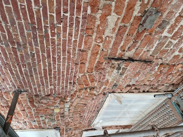 Het restant van de onderste boog hoort bij de nisvormige ontlasting van het rond 1583 in de voormalige poortdoorgang geplaatste venster.