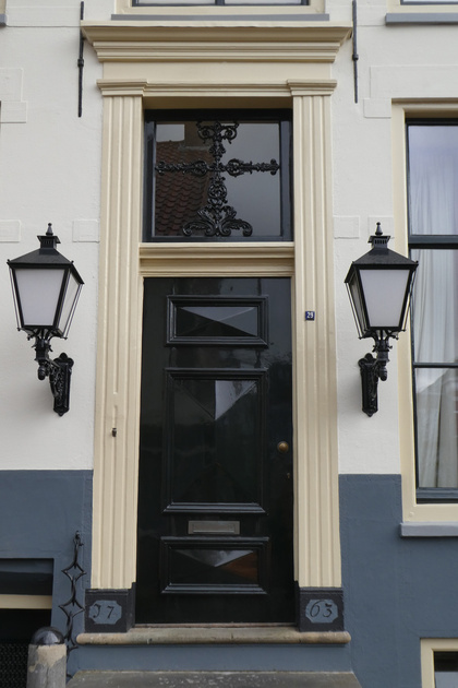 Boven de paneeldeur, geplankeerd door lantaarns, bevindt zich een bovenlicht. Op pilasters rust een hoofdgestel.