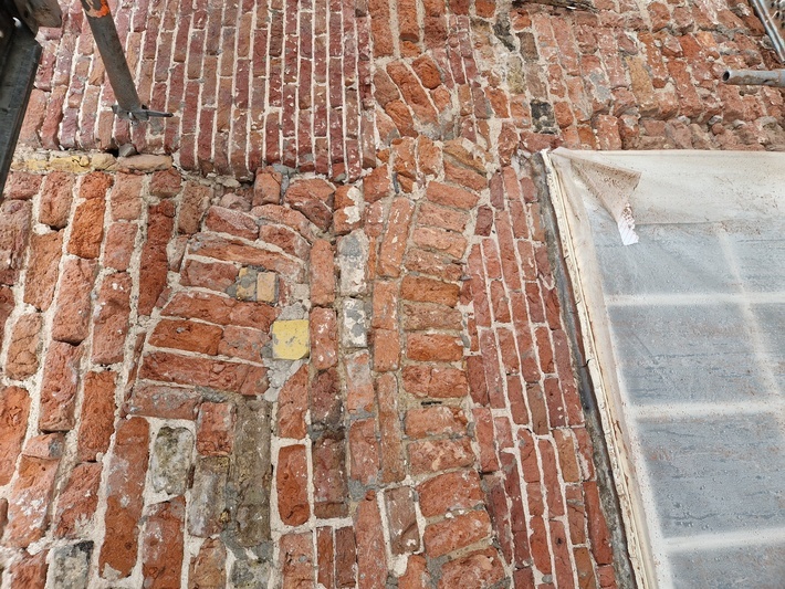 Het restant van de onderste boog hoort bij de nisvormige ontlasting van het rond 1583 in de voormalige poortdoorgang geplaatste venster.