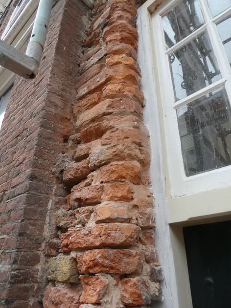 De stenen zijn niet die van vóór de ontpleistering, daarvan was hier niets meer te behouden. De vervanging is gebeurd met oude stenen, die van elders afkomstig zijn.