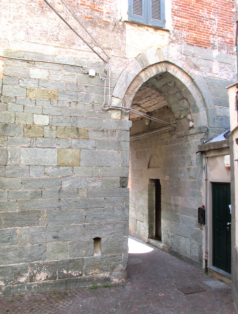 Noli (I), geslachtstoren met publieksdoorgang. Op één steen links naast de hoek is een opening te zien. Dit is de uitmonding van een hemelwaterafvoer, die tot boven toe in de muur uitgespaard was.