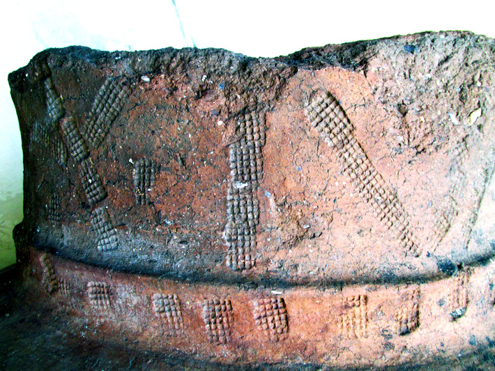 Bij de hals is een slordige stempeldecoratie aangebracht.
