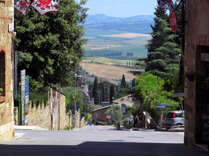 . De hoofdstraat, deel van de Romeinse Via Clodia (SS2), verlaat richting zuiden het stadje via een zeer steile afdaling.