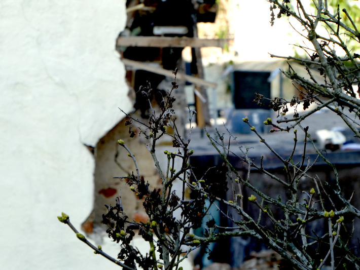 Op deze foto moeilijk te zien: precies aan de rand van het na de klap resterende deel van deze muur is één van de twee kaarsnissen half overgebleven.