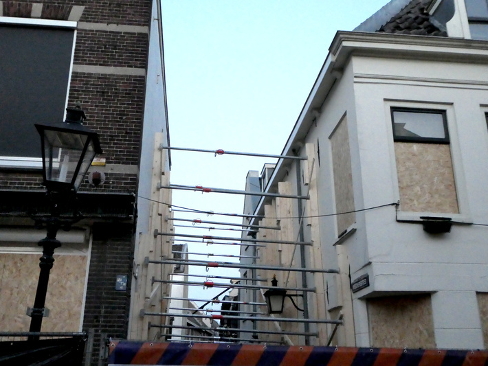 Op deze foto de hoekpanden van de Visscherssteeg, die ernstige schade hebben opgelopen. Tussen de zijgevels zijn veel stutten aangebracht.