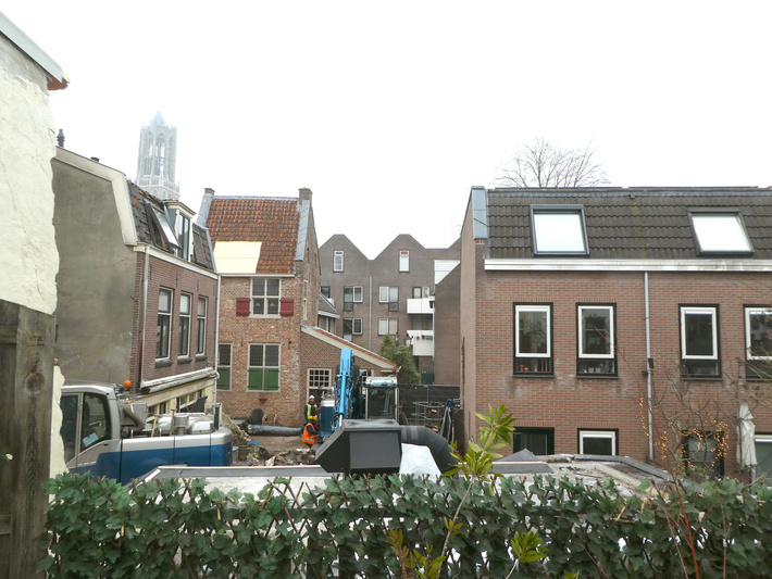 Van rechts naar links de achtergevel van Strosteeg 35 - nieuwbouw 1982,