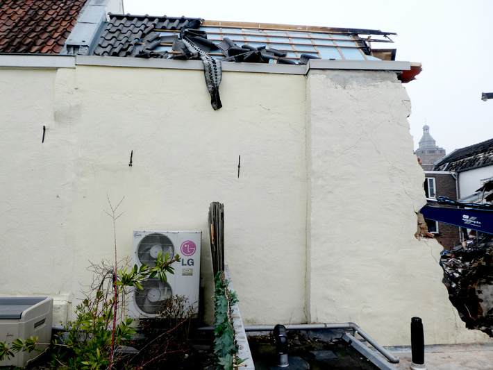 Hij ontstond uit delen van het complex dat gegroeid was vanuit Springweg 16 - middeleeuws dwars achterhuis. Het iets uitspringende rechter gedeelte is wat na de ontploffing overbleef van de linker zijmuur van dat hoofdhuis.