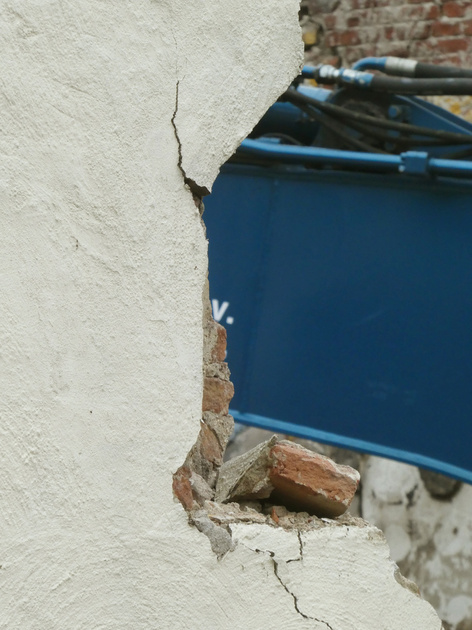Onder de blauwe arm van de shovel doet de losliggende steen nu het ergste vrezen voor het restant van deze kaarsnis.